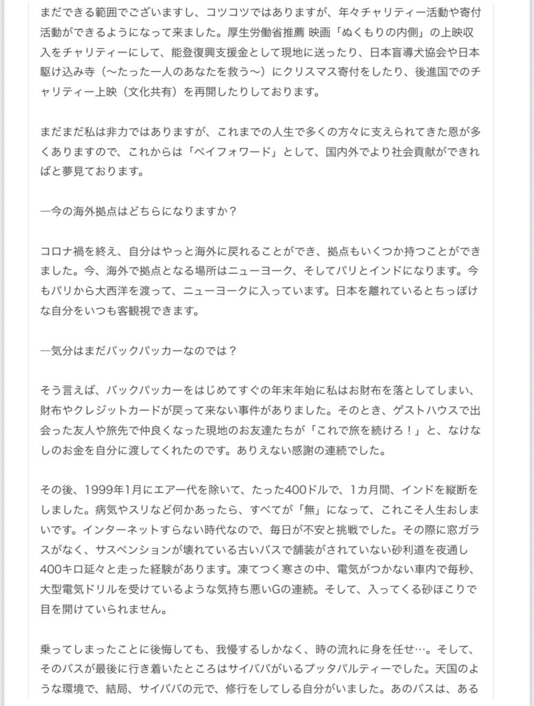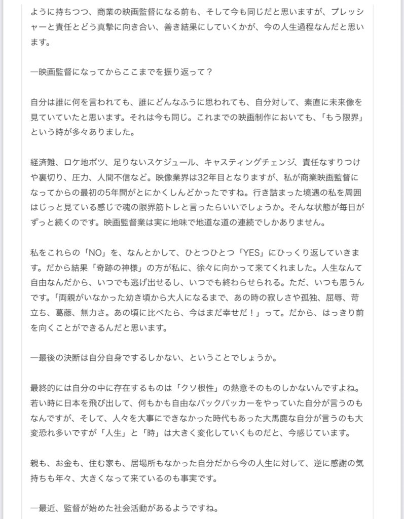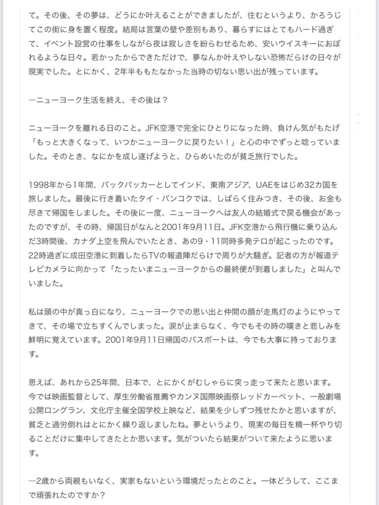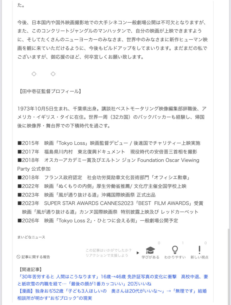 12月31日付け Yahoo!ニュース掲載「映画業界32年目、『風が通り抜ける道』でカンヌに立った田中壱征監督 若き日に挫折した原点 NYで次なる挑戦を語る