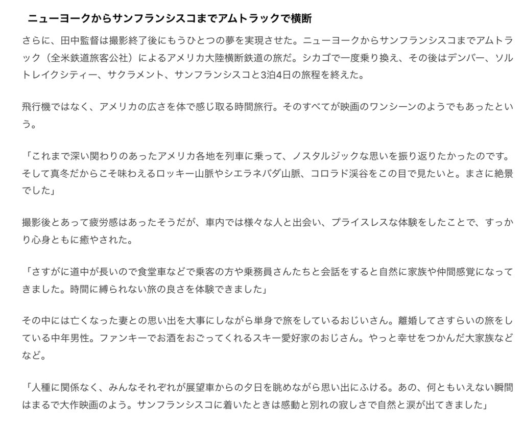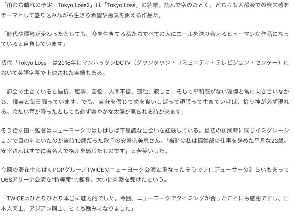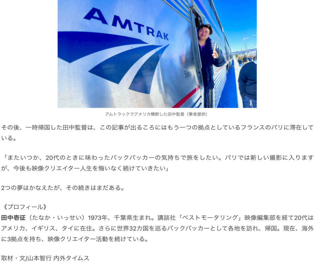 3月20日付け、内外タイムス掲載「『カンヌ』から2年半、映画監督・田中壱征がかなえた2つの夢 NYロケと米大陸横断鉄道の旅】 2026 3/21 NEWS 2026年3月21日 NEWS よかったらシェアしてね! URLをコピーしました! URLをコピーしました! 3月14日付け、日仏共同テレビ局フランス10 掲載「田中壱征監督『Tokyo Loss2』ニューヨーク・マンハッタンでクランクアップ カンヌから2年半、夢のマンハッタン本格撮影」 この記事を書いた人 feelpictures 関連記事 3月14日付け、日仏共同テレビ局フランス10 掲載「田中壱征監督『Tokyo Loss2』ニューヨーク・マンハッタンでクランクアップ カンヌから2年半、夢のマンハッタン本格撮影」 2026年3月17日 12月31日付け Yahoo!ニュース掲載「映画業界32年目、『風が通り抜ける道』でカンヌに立った田中壱征監督 若き日に挫折した原点 NYで次なる挑戦を語る 2025年12月31日 「ぬくもりの内側」札幌プレミアム上映会の様子が新聞に掲載されました。 2025年11月30日 9月18日付け秋田魁新報 掲載 「風が通り抜ける道」プレミアム上映 2025年11月29日 8月11日(月)祝日 「風が通り抜ける道」 東京東プレミアム上映会 無事終了しました。 2025年8月12日 7月19日(土) 『風が通り抜ける道』北九州プレミアム上映会 無事終了しました。 2025年7月21日 7月19日(土) 12:30〜『風が通り抜ける道』北九州プレミアム上映会開催のお知らせ 2025年7月10日 8月11日(月)祝日 「風が通り抜ける道」 東京東プレミアム上映会 開催のお知らせ 2025年5月27日